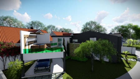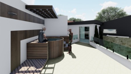lazer com ofurô e churrasqueira, também suspensa sobre a garagem