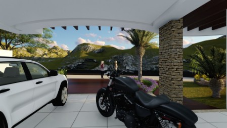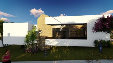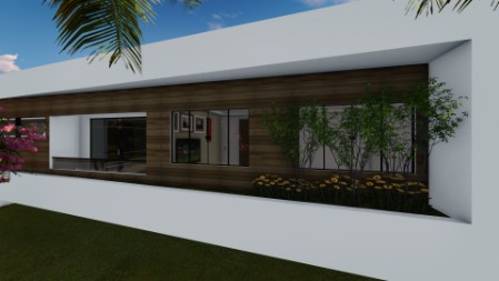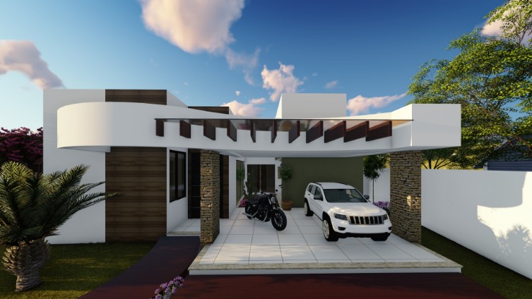 Na fachada o que chama a atenção é a sinuosidade da laje da garagem qu se estende até cobrir a janela do escritório