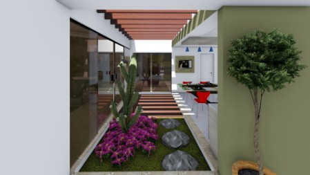 Um jardim interno leva iluminação e ventilação natural para sala, cozinha e espação gourmet