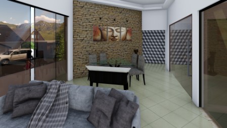 Apesar do terreno em declive o projeto segue de forma linear, dando a impressão de que a casa flutua sobre o terreno.